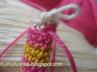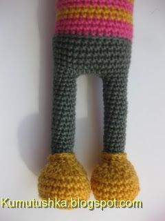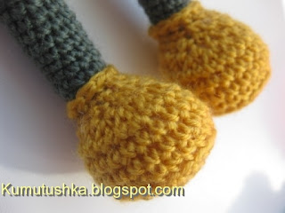 Теперь меняем нить на ту, которую вы запланировали для штанишек (темно-зеленую). Желтой оставить примерно 30 см., она нам еще пригодится. Вяжем темно-зеленой по кругу 11 сбн, цепляя за заднюю стенку петель. Чтобы было похоже, что штанишки заправлены в ботинки, вытаскиваем остаток желтой нити с изнанки наружу и провязываем ей 1 ряд сбн, цепляя за оставленные передние стенки. (этим приемом мы будем пользоваться часто: для оформления ботинок, воротника и рукавчиков) Желтую нить прячем внутрь и продолжаем вязать штаны, вяжем без изменений до той высоты, которая вам нужна. У меня связано 19 рядов (5 см.). Закончить там, где находится середина с внутренней стороны.
