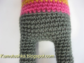 Закончив первую ногу, петлю оставить открытой, отложить деталь. Связать вторую ногу аналогично. Но вязание не заканчиваем, а вяжем дальше 5 в.п., присоединяемся за открытую петлю к другой ноге и вяжем все это дело по кругу.