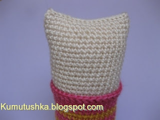 Нитью молочного цвета. По цепочке из 26 в.п. вязать прямыми и обратными рядами 3 ряда сбн, затем деталь сложить вдоль пополам и провязать ряд соединительных петель, соединяя обе половинки.Ну вот, почти все. Осталось только пришить ручки, хвост и оформить мордочку.